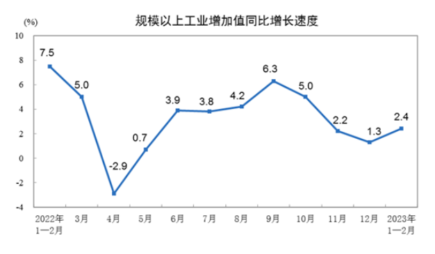 國家統(tǒng)計局3月15日發(fā)布數(shù)據(jù)顯示,今年前2個月,全國規(guī)模以上工業(yè)增加值同比增長2.4%,比2022年12月份加快1.1個百分點;兩年平均增長4.9%。