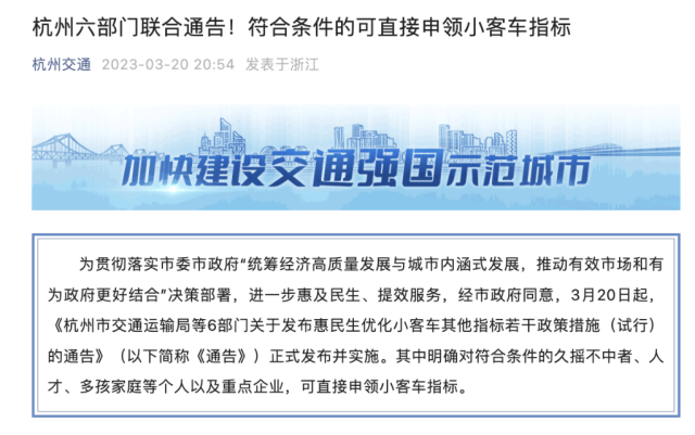 3月20日晚,杭州市交通運(yùn)輸局等6部門發(fā)布通告。(記者截圖)