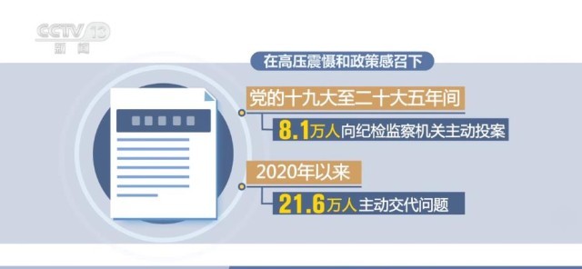 在高壓震懾和政策感召下,黨的十九大至二十大五年間,8.1萬人向紀檢監(jiān)察機關(guān)主動投案,2020年以來,21.6萬人主動交代問題。