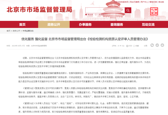 北京市市場(chǎng)監(jiān)督管理局出臺(tái)《檢驗(yàn)檢測(cè)機(jī)構(gòu)資質(zhì)認(rèn)定評(píng)審人員管理辦法》