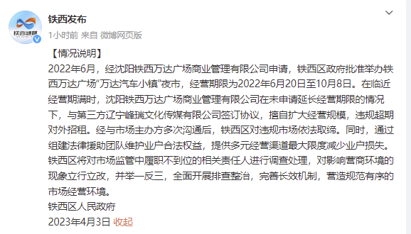 央視網(wǎng)消息:據(jù)@鐵西發(fā)布 微博4月3日消息,鐵西區(qū)人民政府發(fā)布情況說明。2022年6月,經(jīng)沈陽鐵西萬達(dá)廣場商業(yè)管理有限公司申請,鐵西區(qū)政府批準(zhǔn)舉辦鐵西萬達(dá)廣場“萬達(dá)汽車小鎮(zhèn)”夜市,經(jīng)營期限為2022年6月20日至10月8日。在臨近經(jīng)營期滿時,沈陽鐵西萬達(dá)廣場商業(yè)管理有限公司在未申請延長經(jīng)營期限的情況下,與第三方遼寧峰瑞文化傳媒有限公司簽訂協(xié)議,擅自擴大經(jīng)營規(guī)模,違規(guī)超期對外招租。經(jīng)與市場主辦方多次溝通后,鐵西區(qū)對違規(guī)市場依法取締。同時,通過組建法律援助團隊維護業(yè)戶合法權(quán)益,提供多元經(jīng)營渠道最大限度減少業(yè)戶損失。
