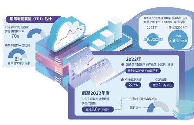 其次,中東消費(fèi)者對(duì)互聯(lián)網(wǎng)、大數(shù)據(jù)、金融科技、新能源等高科技產(chǎn)品和服務(wù)有著旺盛需求,而且有較高的收入水平和支付能力。據(jù)國(guó)際電信聯(lián)盟(ITU)估計(jì),2022年阿拉伯國(guó)家的互聯(lián)網(wǎng)使用率達(dá)70%,擁有手機(jī)的人口比例為81%,高于世界平均水平(73%)。據(jù)估計(jì),2022年,中東和北非地區(qū)消費(fèi)者在數(shù)字產(chǎn)品和服務(wù)上的支出(不包括IT基礎(chǔ)設(shè)施)約為1000億美元,預(yù)計(jì)到2027年將超過(guò)2500億美元。