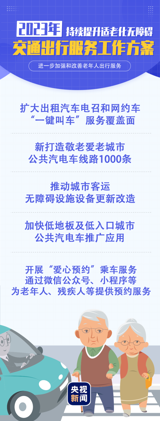 《2023年持續(xù)提升適老化無障礙交通出行服務(wù)工作方案》提出多項目標任務(wù),滿足廣大老年人無障礙出行服務(wù)需要。