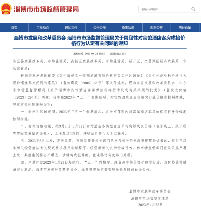 根據(jù)國家發(fā)展改革委《關于做好五一假期旅游市場價格有關工作的通知》《關于構成哄抬價格行為漲價幅度界定問題的意見》(魯價調發(fā)〔2005〕65號)等文件規(guī)定,經(jīng)山東省發(fā)展和改革委員會、山東省市場監(jiān)督管理局《關于淄博市賓館酒店客房哄抬價格行為認定有關問題的批復》(魯發(fā)改價格〔2023〕294號)同意,我市在2023年“五一”假期前后,對賓館酒店客房價格實行漲價幅度控制措施,現(xiàn)就有關問題通知如下: