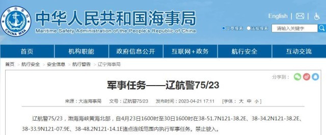 大連海事局發(fā)布航行警告,4月23日16時至30日16時,渤海海峽黃海北部執(zhí)行軍事任務(wù),禁止駛?cè)搿?/p>