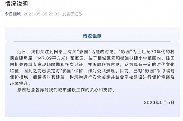 央視網(wǎng)消息:蘇州相城區(qū)委宣傳部公眾號(hào)“今日相城”5月5日發(fā)布情況說(shuō)明稱(chēng),近日關(guān)注到網(wǎng)絡(luò)上有關(guān)“影園”話題的討論?!坝皥@”為上世紀(jì)70年代的村民自建房屋(147.89平方米)和庭園,位于相城區(qū)元和街道擬建小學(xué)范圍內(nèi)。經(jīng)國(guó)內(nèi)相關(guān)領(lǐng)域?qū)<椰F(xiàn)場(chǎng)踏勘和多次論證,并聽(tīng)取各方意見(jiàn),認(rèn)為具有一定的時(shí)代文化特征,因此之前已決定將“影園”保留,作為公共景觀。目前,已對(duì)“影園”采取臨時(shí)保護(hù)措施,后續(xù)將對(duì)其建筑、構(gòu)筑物進(jìn)行安全鑒定并結(jié)合學(xué)校建設(shè)進(jìn)行保護(hù)修繕及環(huán)境提升。