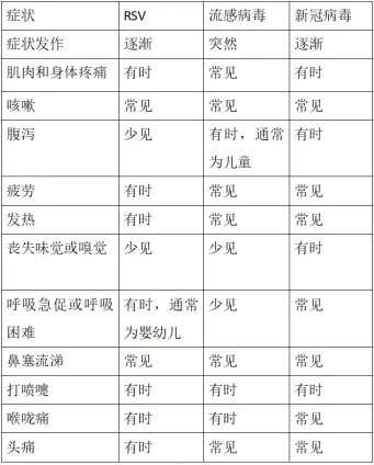 針對(duì)年初到現(xiàn)在流行的新冠病毒、甲型流感病毒和呼吸道合胞病毒,唐蘭芳解釋說,這三種病毒都是通過呼吸道傳播、且傳染性強(qiáng)的病毒,均會(huì)引起發(fā)熱、咳嗽及鼻塞流涕等癥狀,因此有時(shí)很難區(qū)分感染了哪種病毒,雖然這些病毒有不少相似的癥狀,但也有一些區(qū)別,如流感病毒感染潛伏期短,通常是突然發(fā)熱,高熱為主,而另外兩種則是逐漸發(fā)病,且呼吸道合胞病毒感染的患兒中腹瀉較為少見,可以參考表格內(nèi)容,明確診斷的話建議行相關(guān)核酸或抗原檢測(cè)。