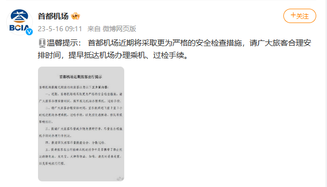 央視網(wǎng)消息:5月16日,@首都機場 官方微博發(fā)布提示:首都機場近期將采取更為嚴(yán)格的安全檢查措施,請廣大旅客合理安排時間,提早抵達機場辦理乘機、過檢手續(xù)。