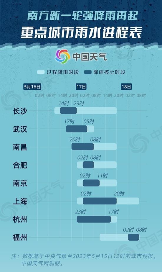 從中國(guó)天氣網(wǎng)推出的重點(diǎn)城市雨水進(jìn)程表可以看出,長(zhǎng)沙、武漢的降雨從明天白天就會(huì)陸續(xù)展開,降雨核心時(shí)段出現(xiàn)在明天下午到晚上。南昌、合肥、南京、上海和杭州的降雨都會(huì)在明天晚上開始,其中南昌的降雨核心時(shí)段集中在明天晚上,合肥、南京、上海和杭州集中在后天白天。福州由于處在最東邊,因此降雨核心時(shí)段最晚,主要集中在18日上午。