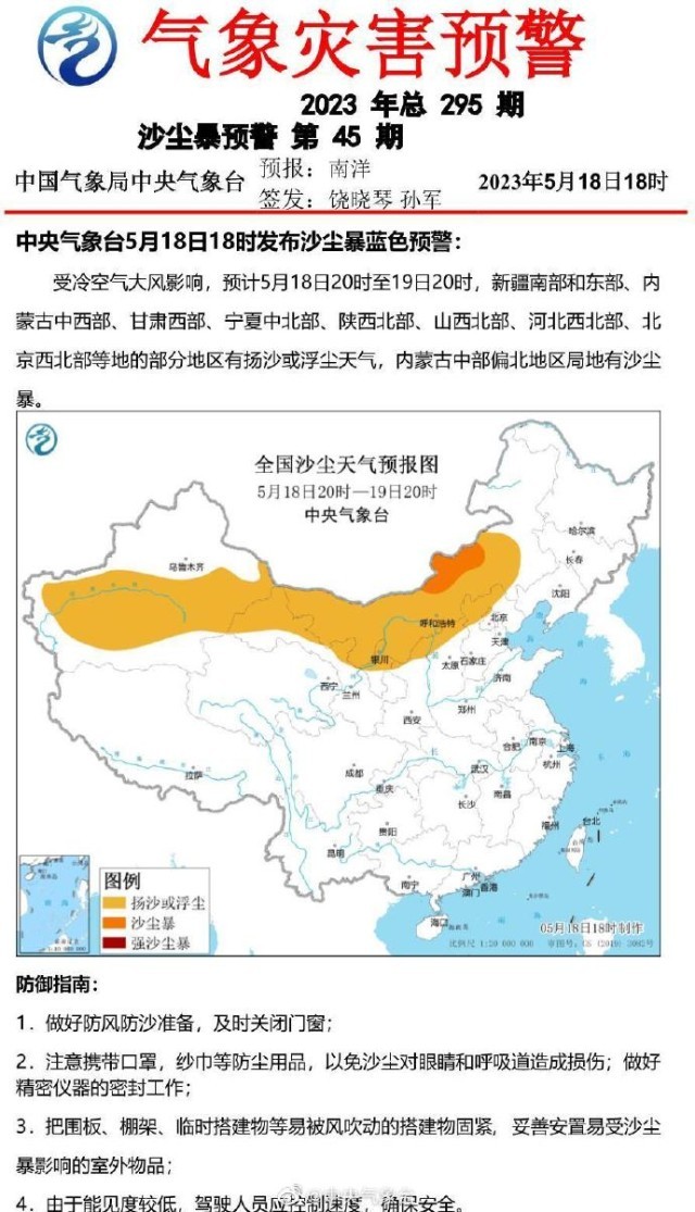 央視網(wǎng)消息:中央氣象臺5月18日18時發(fā)布沙塵暴藍色預警,受冷空氣大風影響,預計5月18日20時至19日20時,新疆南部和東部、內(nèi)蒙古中西部、甘肅西部、寧夏中北部、陜西北部、山西北部、河北西北部、北京西北部等地的部分地區(qū)有揚沙或浮塵天氣,內(nèi)蒙古中部偏北地區(qū)局地有沙塵暴。