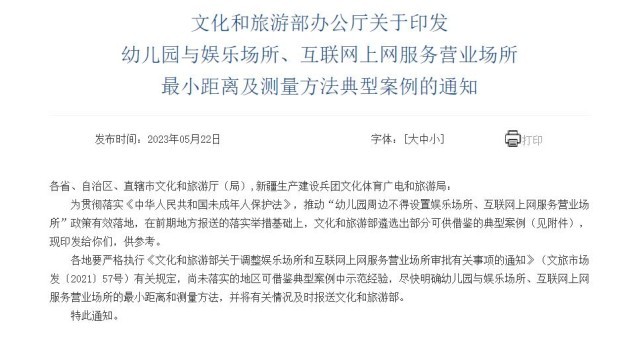 央視網(wǎng)消息:近日,文化和旅游部辦公廳發(fā)布《關(guān)于印發(fā)幼兒園與娛樂場所、互聯(lián)網(wǎng)上網(wǎng)服務(wù)營業(yè)場所最小距離及測量方法典型案例的通知》。主要內(nèi)容如下: