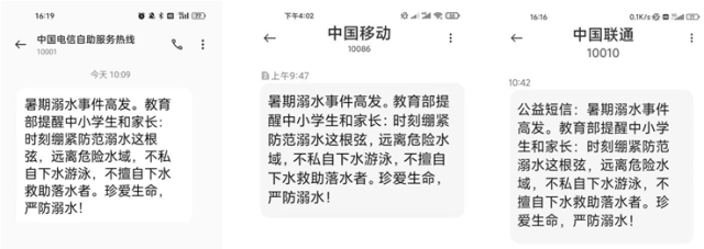 中國(guó)青年報(bào)客戶端北京7月13日電(中青報(bào)·中青網(wǎng)記者 樊未晨)記者今天從教育部獲悉,暑假來(lái)臨,教育部、工信部協(xié)調(diào)中國(guó)電信、中國(guó)移動(dòng)、中國(guó)聯(lián)通三大運(yùn)營(yíng)商,向全國(guó)手機(jī)用戶發(fā)送了暑期防溺水公益短信,提醒廣大中小學(xué)生和家長(zhǎng)增強(qiáng)安全意識(shí),營(yíng)造全社會(huì)關(guān)心支持預(yù)防學(xué)生溺水工作良好氛圍。