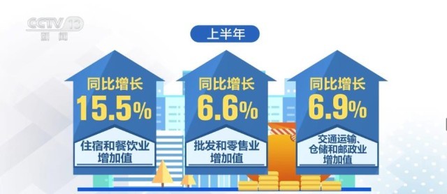 2023年上半年,我國服務業(yè)增加值同比增長6.4%,接觸型服務業(yè)較快增長。上半年,住宿和餐飲業(yè)、批發(fā)和零售業(yè)、交通運輸、倉儲和郵政業(yè)增加值同比分別增長15.5%、6.6%和6.9%。