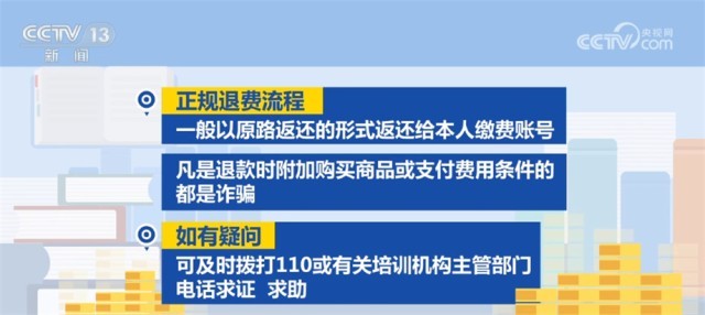 正規(guī)退費流程一般以原路返還的形式返還給本人繳費賬號,凡是退款時附加購買商品或支付費用條件的都是詐騙。如有疑問,可及時撥打110或有關(guān)培訓(xùn)機(jī)構(gòu)主管部門電話求證、求助。