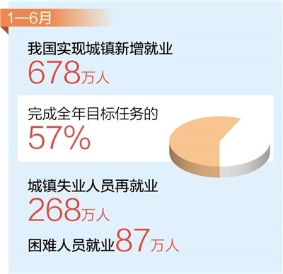 前6月,我國實現(xiàn)城鎮(zhèn)新增就業(yè)678萬人,完成全年目標任務的57% 就業(yè)形勢保持總體穩(wěn)定