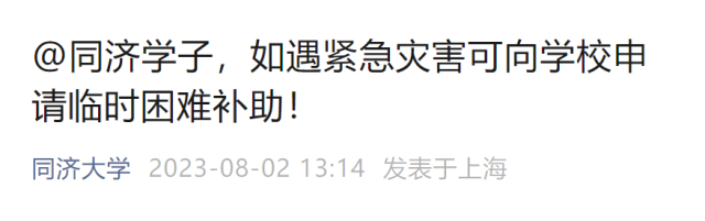 為積極應對并及時為同濟學子提供關心和幫扶,學校設立同濟大學2023年暑期受災地區(qū)學生專項補貼(含2023級錄取新生),如你及你的家庭遇到各類緊急災害、突發(fā)事件(不限于臺風災害),請及時聯(lián)系所在學院的輔導員說明情況,提出緊急災害專項救助申請。