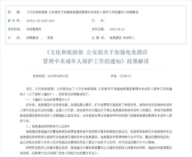 《文化和旅游部 公安部關(guān)于加強(qiáng)電競(jìng)酒店管理中未成年人保護(hù)工作的通知》政策解讀