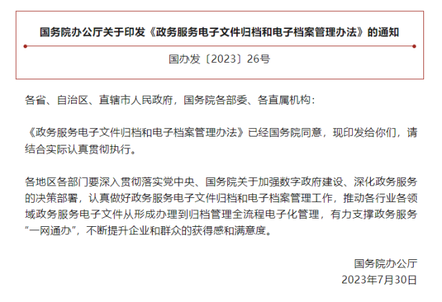 《辦法》就進(jìn)一步規(guī)范政務(wù)服務(wù)電子文件歸檔和電子檔案管理,推動(dòng)各行業(yè)各領(lǐng)域政務(wù)服務(wù)電子文件從形成辦理到歸檔管理全流程電子化,在機(jī)制和流程上提出明確要求,將有力支撐政務(wù)服務(wù)“一網(wǎng)通辦”。