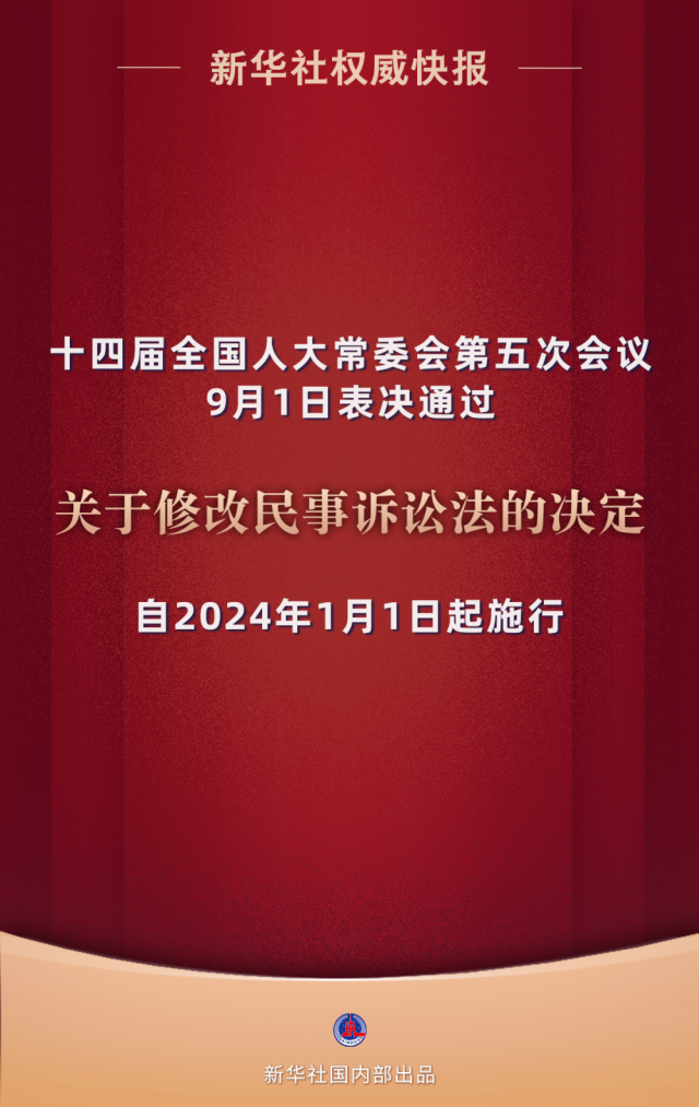 9月1日,十四屆全國人大常委會(huì)第五次會(huì)議表決通過關(guān)于修改民事訴訟法的決定,自2024年1月1日起施行。