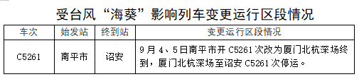 據(jù)中央氣象臺(tái)消息,今年第11號(hào)臺(tái)風(fēng)“海葵”將于5日凌晨到上午在福建漳浦至廣東惠來(lái)一帶沿海登陸,福建東部部分地區(qū)可能有大到暴雨,福建東南部部分地區(qū)有大暴雨,局地特大暴雨。為防范臺(tái)風(fēng)影響,保障運(yùn)輸安全,中國(guó)鐵路南昌局集團(tuán)有限公司調(diào)整部分旅客列車運(yùn)行方案,停運(yùn)途經(jīng)杭深線管內(nèi)漳州(不含)至詔安區(qū)段旅客列車。