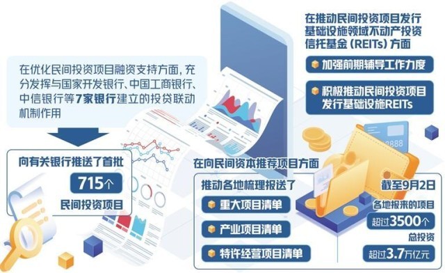 為貫徹落實《意見》,國家發(fā)展改革委印發(fā)了《關于進一步抓好抓實促進民間投資工作努力調(diào)動民間投資積極性的通知》,提出了17項有針對性的具體措施。據(jù)介紹,在優(yōu)化民間投資項目融資支持方面,充分發(fā)揮與國家開發(fā)銀行、中國工商銀行、中信銀行等7家銀行建立的投貸聯(lián)動機制作用,向有關銀行推送了首批715個民間投資項目,請有關金融機構(gòu)按照市場化、法治化原則,自主選擇符合條件的項目給予金融支持。在向民間資本推薦項目方面,推動各地梳理報送了重大項目清單、產(chǎn)業(yè)項目清單、特許經(jīng)營項目清單。截至9月2日,各地報來的項目超過3500個,總投資超過3.7萬億元。在推動民間投資項目發(fā)行基礎設施領域不動產(chǎn)投資信托基金(REITs)方面,加強前期輔導工作力度,積極推動民間投資項目發(fā)行基礎設施REITs。近日,國家發(fā)展改革委向證監(jiān)會推薦了金風科技風力發(fā)電項目,這是推薦的首單民間投資清潔能源REITs項目。