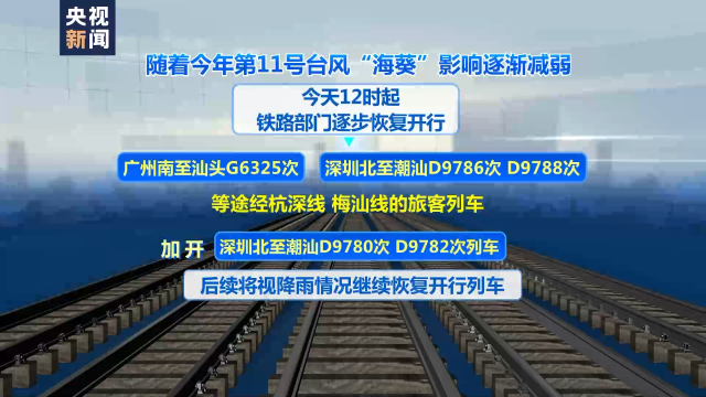 隨著今年第11號臺風(fēng)“海葵”影響逐漸減弱,5日12時起,鐵路部門逐步恢復(fù)開行廣州南至汕頭G6325次、深圳北至潮汕D9786次、D9788次等途經(jīng)杭深線、梅汕線的旅客列車,加開深圳北至潮汕D9780次、D9782次列車。后續(xù)將視降雨情況,繼續(xù)恢復(fù)開行列車。