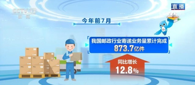 央視網(wǎng)消息:今年前7月,我國郵政行業(yè)寄遞業(yè)務(wù)量累計完成873.7億件,同比增長12.8%。其中,快遞業(yè)務(wù)量累計完成703億件,同比增長15.5%;國際/港澳臺快遞業(yè)務(wù)量累計完成16.1億件,同比增長57.2%。