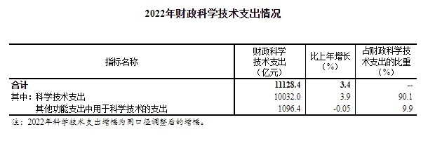 2022年,國家財政科學(xué)技術(shù)支出11128.4億元,比上年增加361.7億元,增長3.4%。其中,中央財政科技支出3803.4億元,占全國財政科技支出的比重為34.2%;地方財政科技支出7325.0億元,占比為65.8%。