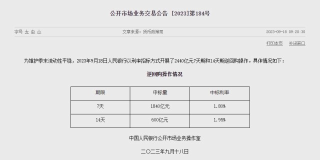 央視網(wǎng)消息:中國人民銀行發(fā)布公告,為維護(hù)季末流動(dòng)性平穩(wěn),9月18日以利率招標(biāo)方式開展2440億元7天期和14天期逆回購操作。