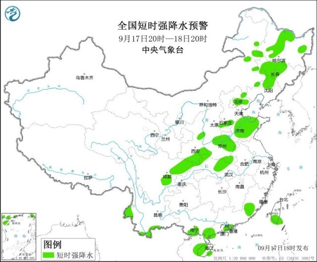 中央氣象臺(tái)9月17日18時(shí)繼續(xù)發(fā)布強(qiáng)對(duì)流天氣藍(lán)色預(yù)警