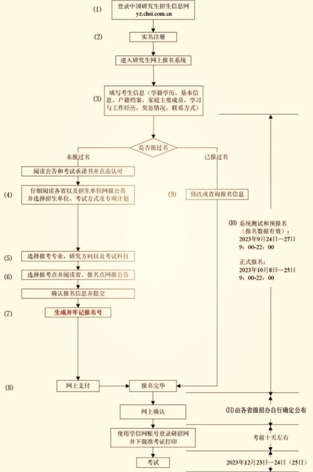 (1)考生應(yīng)在規(guī)定時間登錄“中國研究生招生信息網(wǎng)”(網(wǎng)址:https://yz.chsi.com.cn)瀏覽報考須知,并按省級教育招生考試機(jī)構(gòu)、報考點(diǎn)以及報考招生單位的網(wǎng)上公告要求報名;