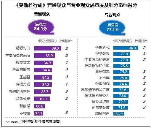 在不同觀眾評價上,《莫斯科行動》相對更受普通觀眾青睞,普通觀眾滿意度得分84.1分,居檔期第二位,與《堅如磐石》相差0.1分;專業(yè)觀眾滿意度得分77.1分,居檔期第三位。在細分指標中,影片視覺效果和主要演員的表演均得到了不同觀眾的高度認可,得分為各自評價指標體系的前三名,也都居檔期五部影片的前三位。