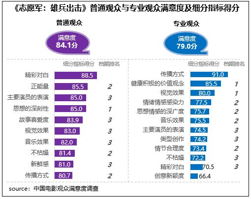 在不同觀眾評價上,《志愿軍:雄兵出擊》相對更受專業(yè)觀眾青睞,專業(yè)觀眾滿意度得分79.0分,居檔期第二位;在細分指標中,健康積極的價值觀念、視覺效果兩項指標得分居檔期首位,同時分別居2023年調(diào)查50部影片的第4位和第8位。影片普通觀眾滿意度得分84.1分,居檔期第三位,僅比《堅如磐石》和《93國際列車大劫案:莫斯科行動》分別低0.1分、0.02分,細分指標中思想深刻性得分居檔期首位。