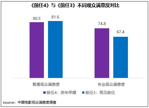 《前任4:英年早婚》在同系列影片輕松、寫實創(chuàng)作風(fēng)格基礎(chǔ)上,進階到婚姻話題探討,并進一步強化對觀眾現(xiàn)實情感生活的細致洞察,成為當代人的愛情圖鑒。在不同觀眾評價中,影片相對更受專業(yè)觀眾的青睞,專業(yè)觀眾滿意度得分74.8分,高于上一部作品7.4分,其中精彩對白、傳播方式得分居檔期第二和第三位;但普通觀眾對其評價一般,滿意度得分80.5分,比上一部低1.1分。
