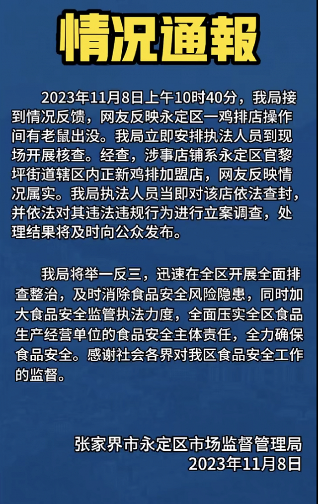 官方通報(bào)“張家界景區(qū)小吃店老鼠扎堆亂竄”:屬實(shí),涉事正新雞排加盟店已被查封
