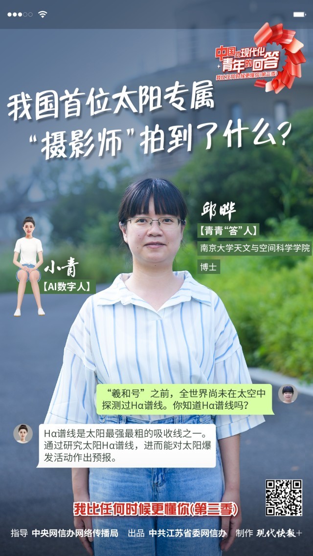 11月7日,“中國(guó)式現(xiàn)代化·青年的回答——我比任何時(shí)候更懂你(第三季)”系列短視頻之《我國(guó)首位太陽(yáng)專屬“攝影師”拍到了什么?》正式上線。本集視頻中,青青“答”人——南京大學(xué)天文與空間科學(xué)學(xué)院博士邱曄和AI數(shù)字人小青,為大家展示了我國(guó)首顆探日衛(wèi)星“羲和號(hào)”拍攝到的畫(huà)面,解釋了“羲和號(hào)”超長(zhǎng)全稱里的兩個(gè)關(guān)鍵詞的含義。