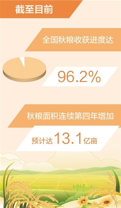 本報(bào)北京11月11日電 (記者郁靜嫻)農(nóng)業(yè)農(nóng)村部最新農(nóng)情調(diào)度顯示:伴隨玉米大豆及中稻收獲進(jìn)入尾聲、南方晚稻收獲加速推進(jìn),全國(guó)秋糧收獲進(jìn)度達(dá)96.2%,基本實(shí)現(xiàn)豐收到手。今年以來(lái),我國(guó)糧食生產(chǎn)克服局部地區(qū)洪澇干旱等災(zāi)害影響,全年糧食產(chǎn)量有望再創(chuàng)新高。