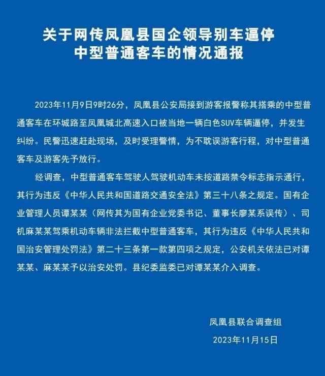 央視網(wǎng)消息:據(jù)鳳凰融媒微信公眾號(hào)消息,11月15日,鳳凰縣聯(lián)合調(diào)查組發(fā)布情況通報(bào),經(jīng)調(diào)查,中型普通客車(chē)駕駛?cè)笋{駛機(jī)動(dòng)車(chē)未按道路禁令標(biāo)志指示通行,其行為違反相關(guān)規(guī)定。國(guó)有企業(yè)管理人員譚某某 (網(wǎng)傳其為國(guó)有企業(yè)黨委書(shū)記、董事長(zhǎng)廖某系誤傳)、司機(jī)麻某某駕乘機(jī)動(dòng)車(chē)輛非法攔截中型普通客車(chē),其行為違反相關(guān)規(guī)定,公安機(jī)關(guān)依法已對(duì)譚某某、麻某某予以治安處罰。縣紀(jì)委監(jiān)委已對(duì)譚某某介入調(diào)查。