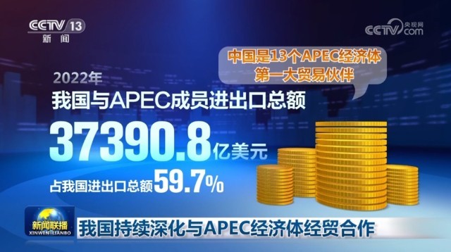 央視網(wǎng)消息(新聞聯(lián)播):商務(wù)部最新數(shù)據(jù)顯示,2022年,我國(guó)與APEC成員進(jìn)出口總額為37390.8億美元,占我國(guó)進(jìn)出口總額的59.7%。中國(guó)是13個(gè)APEC經(jīng)濟(jì)體的第一大貿(mào)易伙伴。