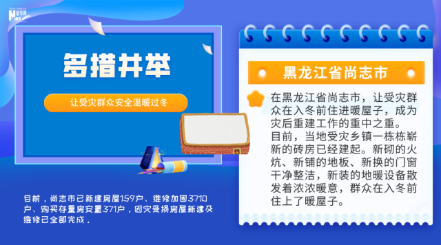 尚志市委書記劉海濤介紹,目前,尚志市已新建房屋159戶、維修加固3710戶、購(gòu)買存量房安置371戶,因?yàn)?zāi)受損房屋新建及維修已全部完成。