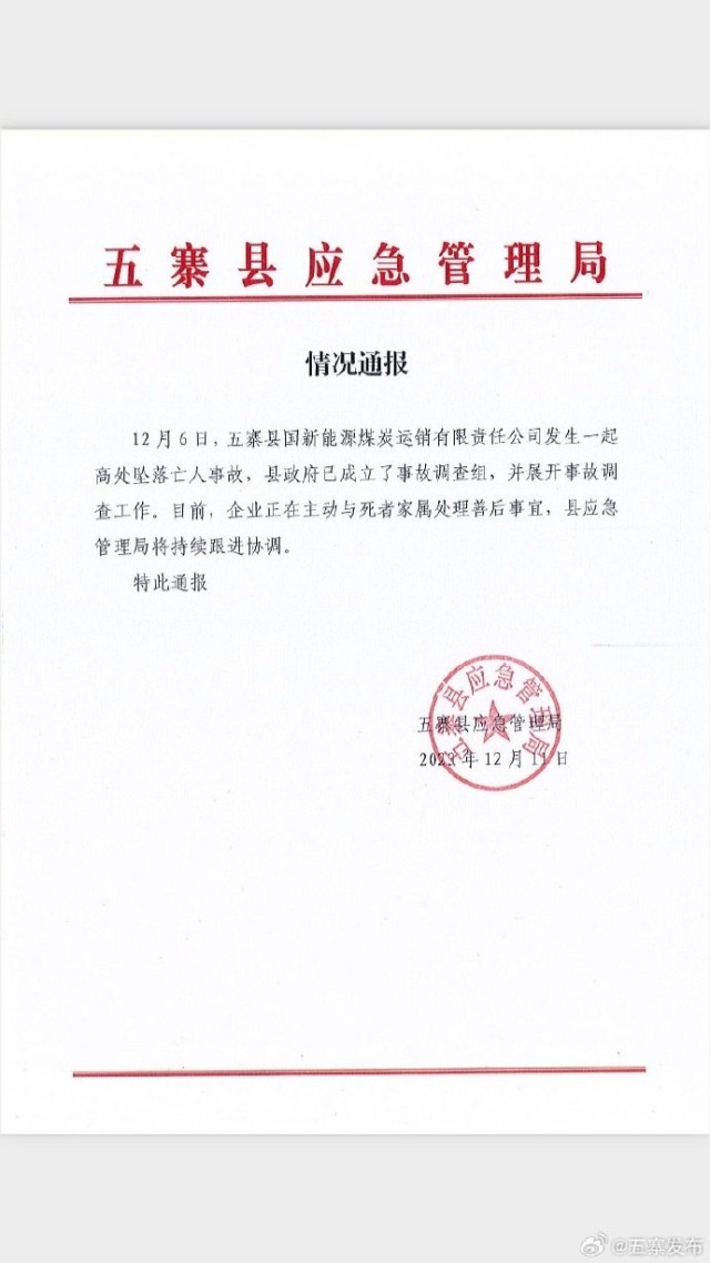 國新能源煤炭運(yùn)銷公司發(fā)生墜亡事故 山西省忻州市五寨縣官方:展開調(diào)查