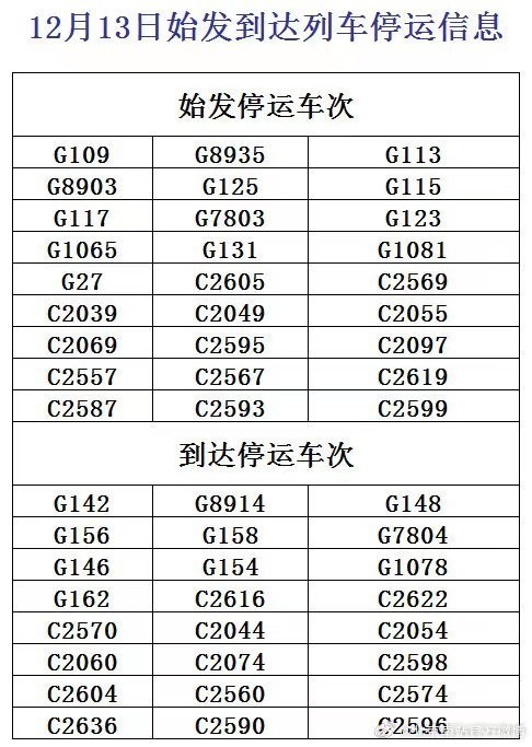 據(jù)北京西站官方微博今天中午最新消息,受降雪影響,12月13日,北京西站G57、G807、G97次列車臨時(shí)停運(yùn),北京豐臺(tái)站G63、G629次列車臨時(shí)停運(yùn)。今天早上,北京西站、北京豐臺(tái)站已發(fā)布部分停運(yùn)列車信息。已購(gòu)買(mǎi)停運(yùn)列車車票的旅客,可于30日內(nèi)辦理全額退票手續(xù)。請(qǐng)廣大旅客合理安排出行,關(guān)注車站公告或12306網(wǎng)站信息。