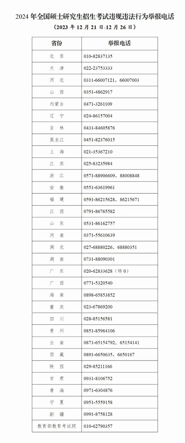 教育部和各省(區(qū)、市)教育招生考試機構(gòu)將開通2024年研考舉報電話,歡迎廣大考生及社會各界人士及時舉報反映有關(guān)問題線索。教育部及各省(區(qū)、市)將會同有關(guān)部門根據(jù)舉報線索第一時間核查處理,堅決維護風(fēng)清氣正的研考環(huán)境。