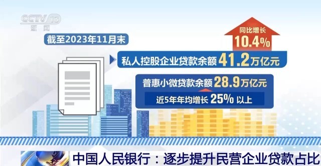 在信貸政策方面,開(kāi)展中小微企業(yè)金融服務(wù)能力提升工程,完善金融服務(wù)體系,增強(qiáng)民營(yíng)貸款的穩(wěn)定性。截至2023年11月末,私人控股企業(yè)貸款余額41.2萬(wàn)億元,同比增長(zhǎng)10.4%;普惠小微貸款余額28.9萬(wàn)億元,近5年年均增長(zhǎng)25%以上。