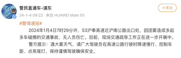 央視網消息:據警民直通車-浦東通報,1月4日7時29分許,S3滬奉高速近滬南公路出口處,因團霧造成多起多車碰擦的交通事故,無人員傷亡。目前,現(xiàn)場交通疏導工作正在進一步開展中。