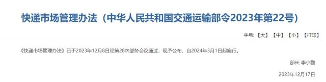 央視網(wǎng)消息:《快遞市場(chǎng)管理辦法》已于2023年12月8日經(jīng)第28次部務(wù)會(huì)議通過(guò),現(xiàn)予公布,自2024年3月1日起施行。