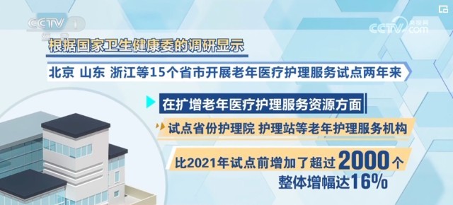 數(shù)據(jù)顯示,我國60歲及以上老年人已達2.8億。其中,超4000萬人失能、半失能,需要專業(yè)醫(yī)療護理服務。國家衛(wèi)生健康委調(diào)研顯示,北京、山東、浙江等15個省、市開展老年醫(yī)療護理服務試點兩年來,在擴增老年醫(yī)療護理服務資源方面,試點省份護理院、護理站等老年護理服務機構(gòu)數(shù)量明顯增加,比2021年試點前增加了超過2000個,整體增幅達16%。