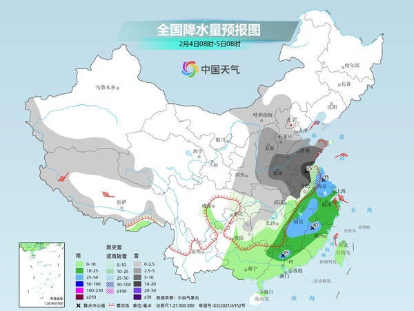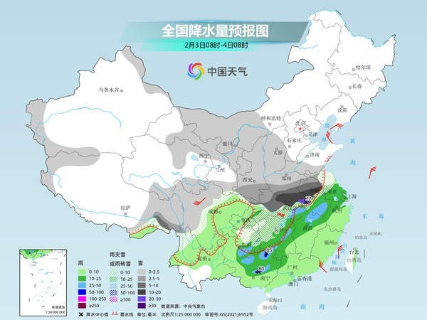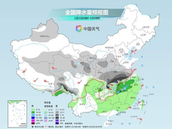 未來三天(2月2日至4日),中東部大范圍雨雪冰凍天氣過程進(jìn)入鼎盛時(shí)段,江漢至黃淮一帶將遭遇強(qiáng)降雪,局地或現(xiàn)大暴雪,江南、華南局地有暴雨,并可能出現(xiàn)強(qiáng)對(duì)流天氣。在冷空氣和雨雪天氣共同影響下,中東部多地濕冷感明顯。春運(yùn)高峰期將至,公眾需注意出行安全,做好防寒保暖措施。