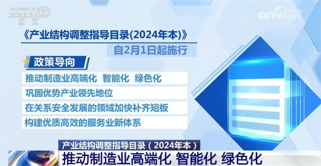 《產(chǎn)業(yè)結(jié)構(gòu)調(diào)整指導(dǎo)目錄(2024年本)》自2月1日起施行?!赌夸洠?024年本)》的政策導(dǎo)向是,推動制造業(yè)高端化、智能化、綠色化,鞏固優(yōu)勢產(chǎn)業(yè)領(lǐng)先地位,在關(guān)系安全發(fā)展的領(lǐng)域加快補(bǔ)齊短板,構(gòu)建優(yōu)質(zhì)高效的服務(wù)業(yè)新體系。