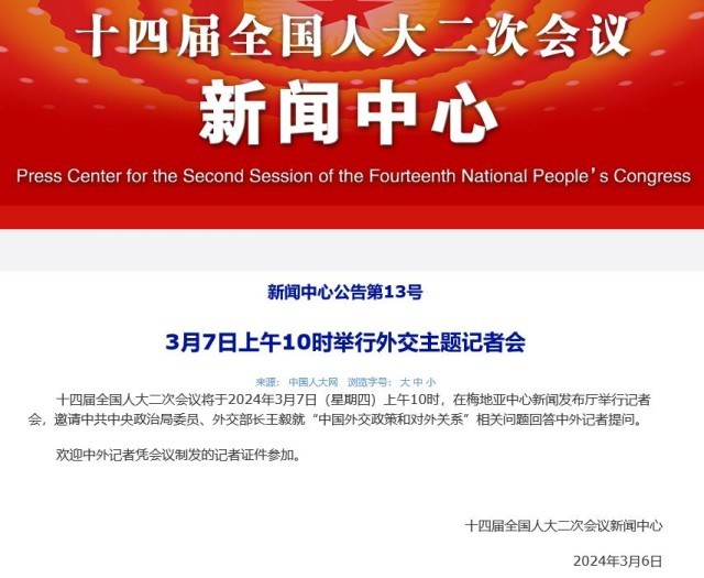 十四屆全國人大二次會議將于3月7日上午10時舉行外交主題記者會